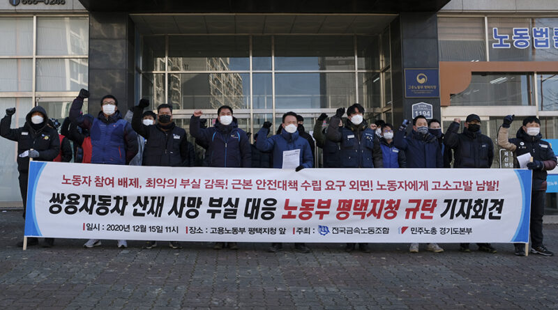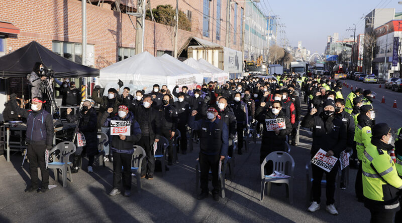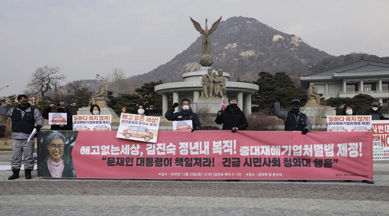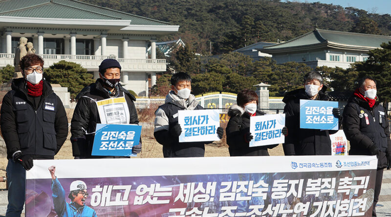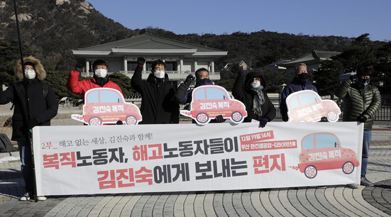 ▲ 금속노조와 시민사회단체들이 12월 22일 오전 서울 청와대 분수대 앞에서 기자회견을 열고, 한진중공업지회 조합원 ‘용접공 김진숙’의 복직을 촉구하고 있다. 김진숙 조합원의 연내 복직이 아흐레 남은 상태다. 이들은 김진숙 조합원 복직 요구를 걸고 집단 단식을 비롯한 3,000배 행동, 오체투지 등 긴급행동을 벌인다. 변백선 ▲ 금속노조 부산양산지부와 시민사회단체 등 각계 대표자들이 12월 22일 오전 서울 청와대 분수대 앞에서 ‘김진숙 정년 내 복직, 문재인 대통령이 책임져라. 시민사회 긴급 청와대 행동’ 기자회견을 마친 뒤 단식을 시작하고 있다. 변백선 ▲ 김호규 위원장이 12월 22일 청와대 앞에서 연 ‘김진숙 정년 내 복직, 문재인 대통령이 책임져라. 시민사회 긴급 청와대 행동’ 기자회견에서 “정부와 자본이 서로 책임을 떠넘기고 있는 상황을 묵과할 수 없다. 김진숙의 복직을 넘어 모든 해고자의 복직을 위해 긴급 행동에 들어간다”라고 밝히고 있다. 변백선 ▲ 금속노조 부산양산지부 한진중공업지회 조합원..