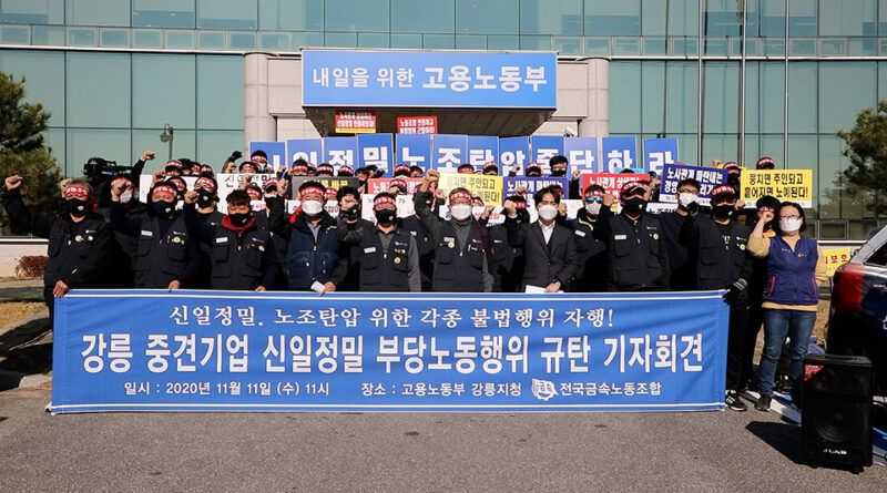 금속노조 신일정밀지회는 11월 11일 강원도 강릉시 고용노동부 강릉지청 본관 앞에서 ‘강릉 중견기업 신일정밀, 노조탄압을 위한 부당노동행위 고소 기자회견’을 열었다.