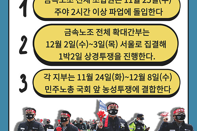 금속노조는 11월 4일 서울 여의도 더불어민주당사 앞에서 ‘노조파괴법을 파괴하라. 금속노조 결의대회’를 열었다. 노조 각 지부는 전국 각지 민주당사 앞에서 결의대회와 선전전, 행진 등을 벌였다.
