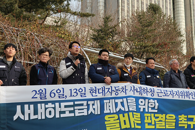지회는 1월 29일 서울 서초구 서울중앙지방법원 앞에서 ‘사내하도급제 폐지와 2차 하청 노동자 근로자지위 확인 소송에 대한 사법부의 올바른 판단을 촉구하는 기자회견’을 열었다. 서울중앙지방법원은 오는 2월 6일과 13일에 각각 재판을 열고 재하도급 노동자들의 근로자지위에 관한 판결을 할 예정이다.