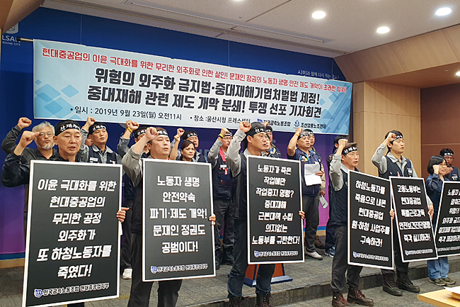 기자회견에 참석한 박근태 금속노조 현대중공업지부장은 “한 해 현장에서 사고로 숨지는 노동자가 2천4백여 명에 이른다”라며 “1975년 현대중공업에서 창사 이후 매해 열 명 이상의 노동자가 중대 재해 등으로 사망했다”라고 안타까워했다. 박근태 지부장은 “이윤만 챙기는 자본과 생명안전제도를 후퇴시키는 정부 탓에 산재 사망사고가 계속 일어나고 있다”라고 규탄했다.