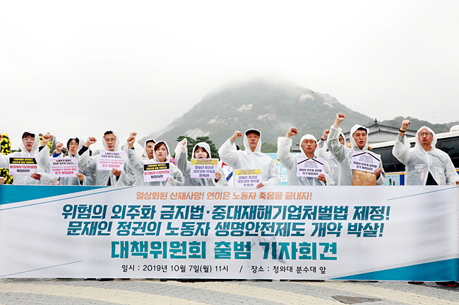이날 약칭 ‘위험의 외주화 금지 대책위원회(아래 대책위)’는 문재인 정부에 위험의 외주화 금지법 등 법 제도와 대책 마련을 촉구했다. 대책위는 “노동자 생명안전 제도개선을 위해 전국에서 투쟁을 펼치겠다”라고 선언했다.