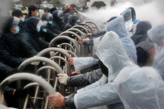 | ▲ 2010년 3월 4일 발레오만도 회사 앞에 모인 노조 경주지부 조합원들이 업무복귀를 위해 현장진입을 시도하자 회사가 고용한 용역깡패들이 물대포와 소화기를 쏘아대며 이를 저지하고 있다. 사측은 2월 16일 직장폐쇄를 저질렀다. <자료사진> |