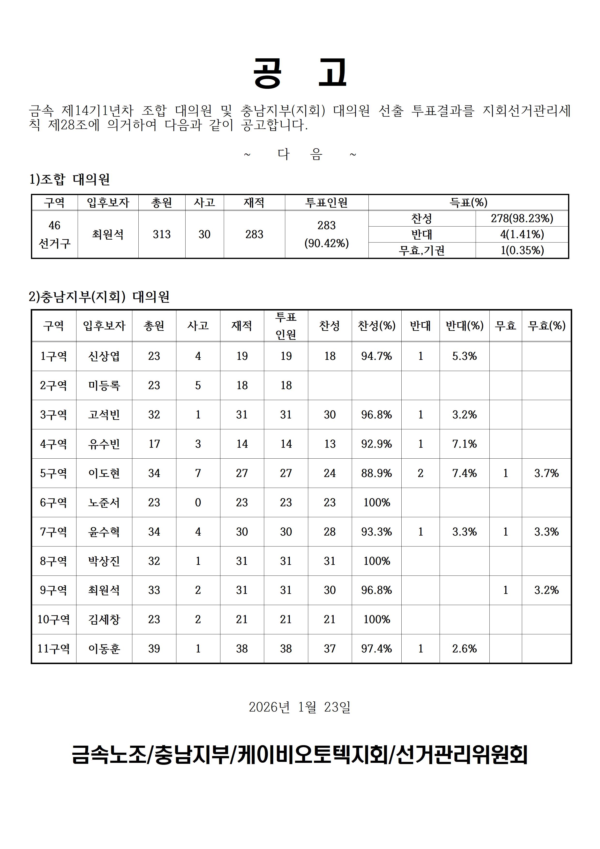 14기1년차 조합,지부(지회) 대의원 투표결과공고