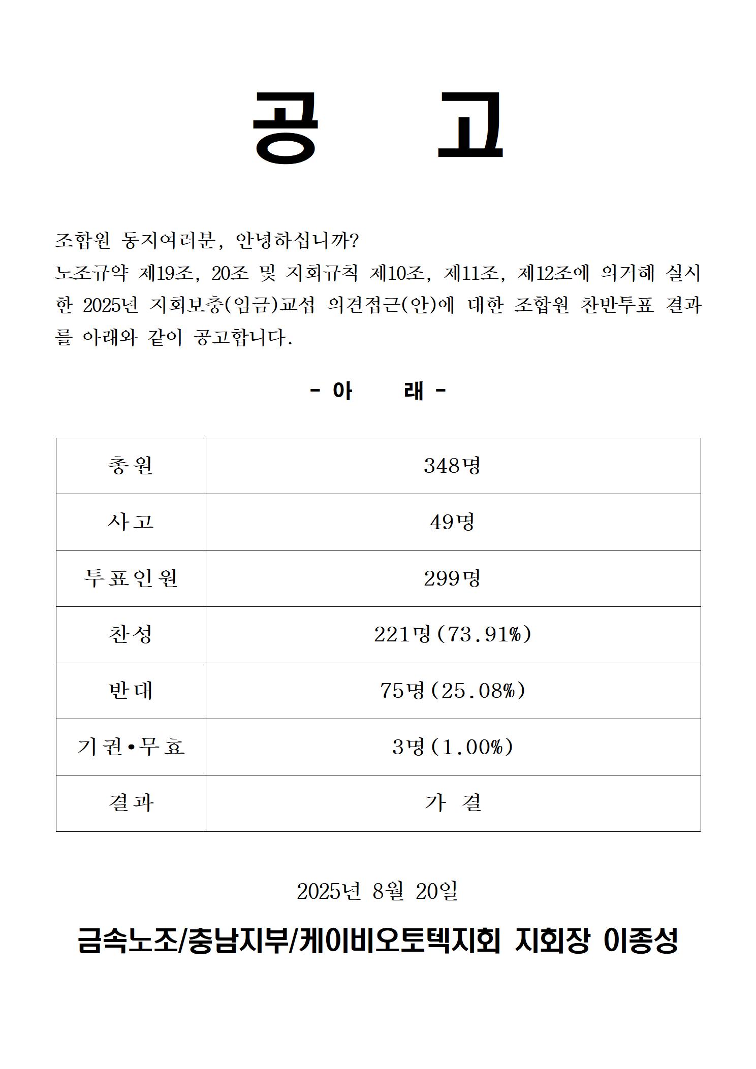 2025년 지회보충교섭(임금) 조합원 총회(찬반투표) 결과공고